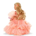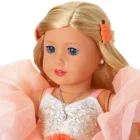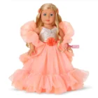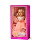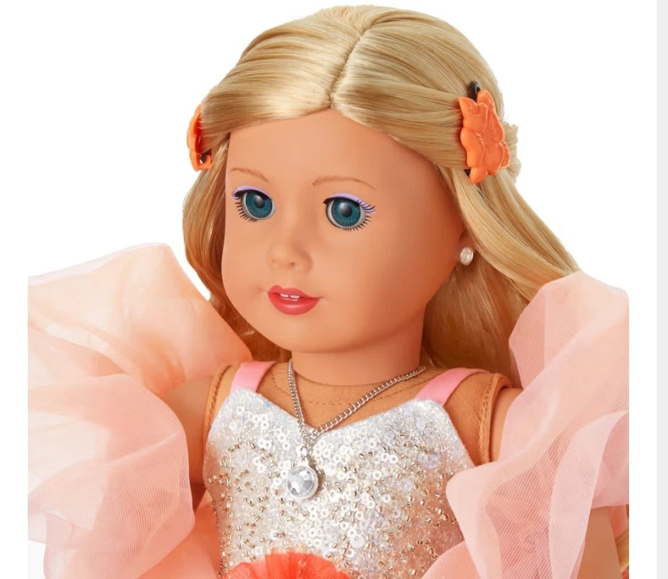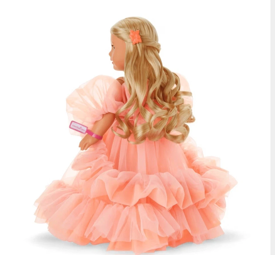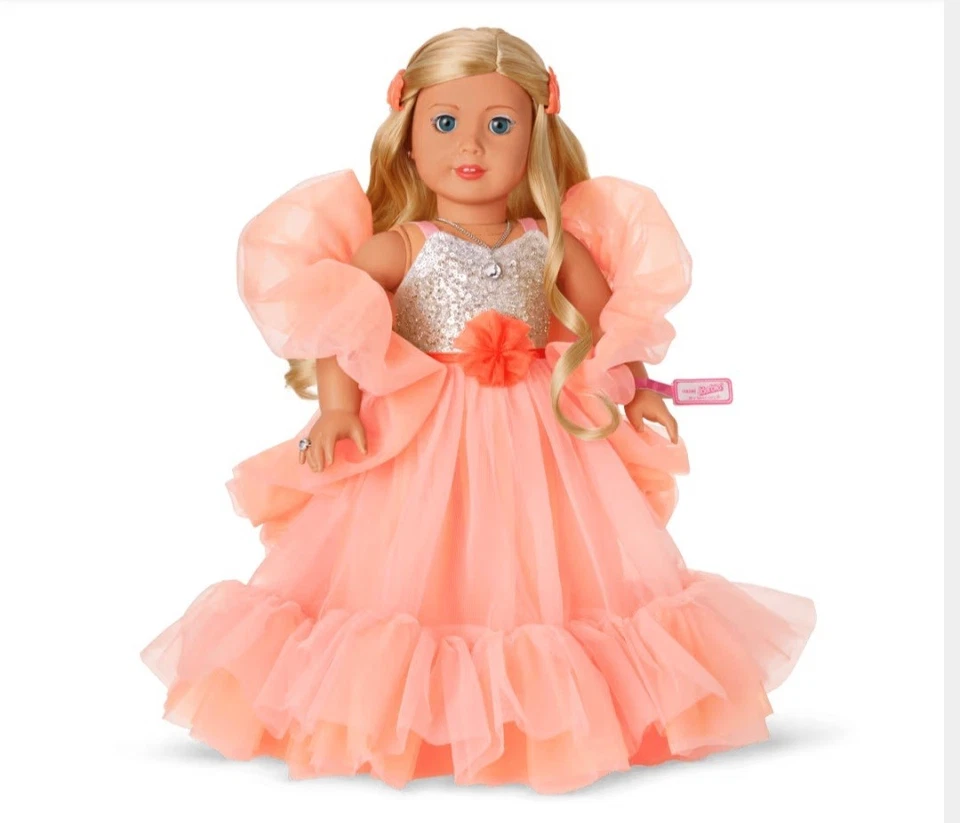 Absolutley Gorgeous 18 inch Americab girl doll inspired By Barbie Peaches and cream  classic  theme. Doll has beautiful blue eyes that open and close , long cascading wavy hair, rhinestone   earrings and necklace, peach tulle dress with sequin cream colored bodice.  Doll comes with hair accessories and white stand,   shipped  in a stunning  barbie  styled box just like the original toy.