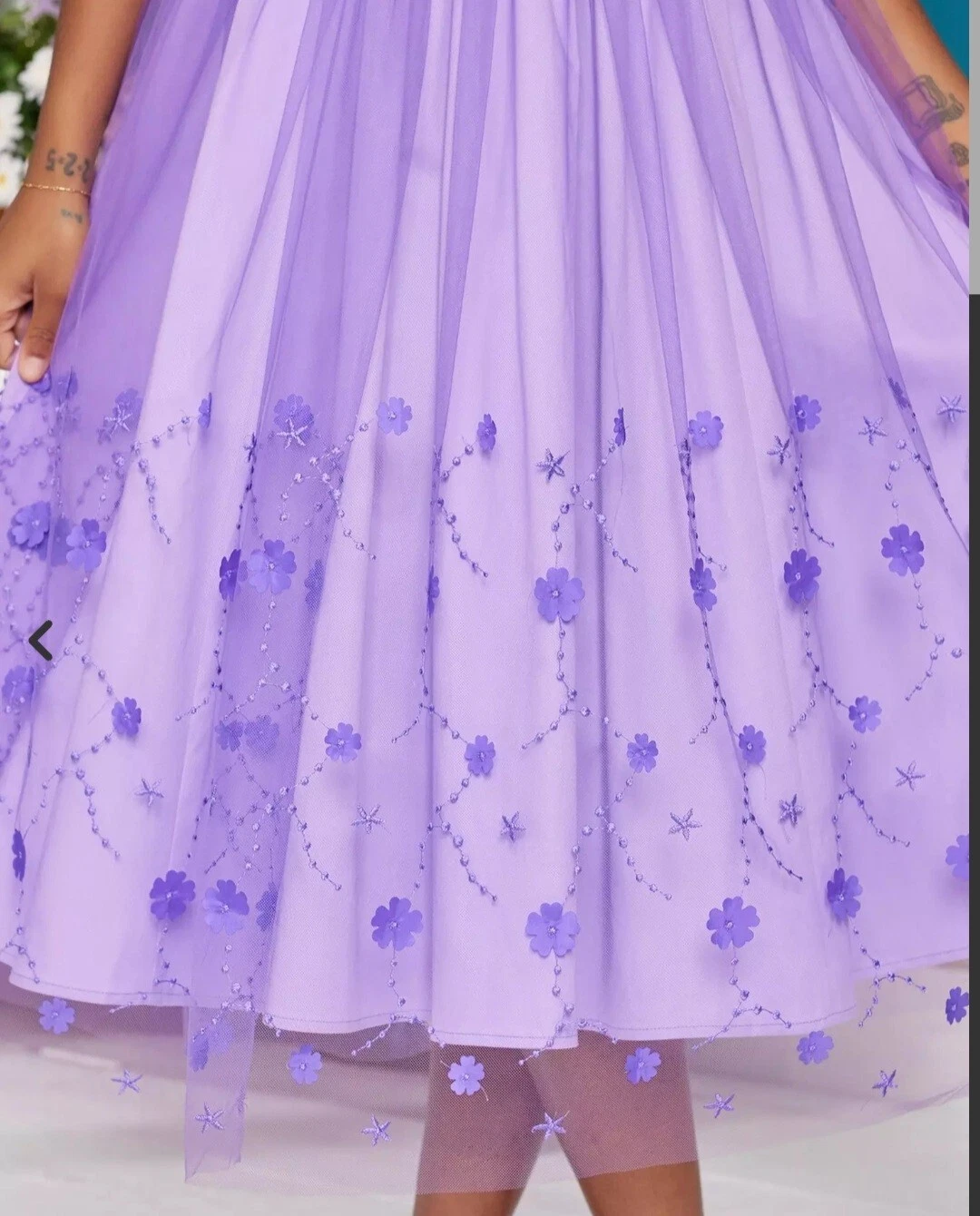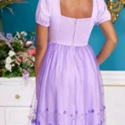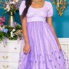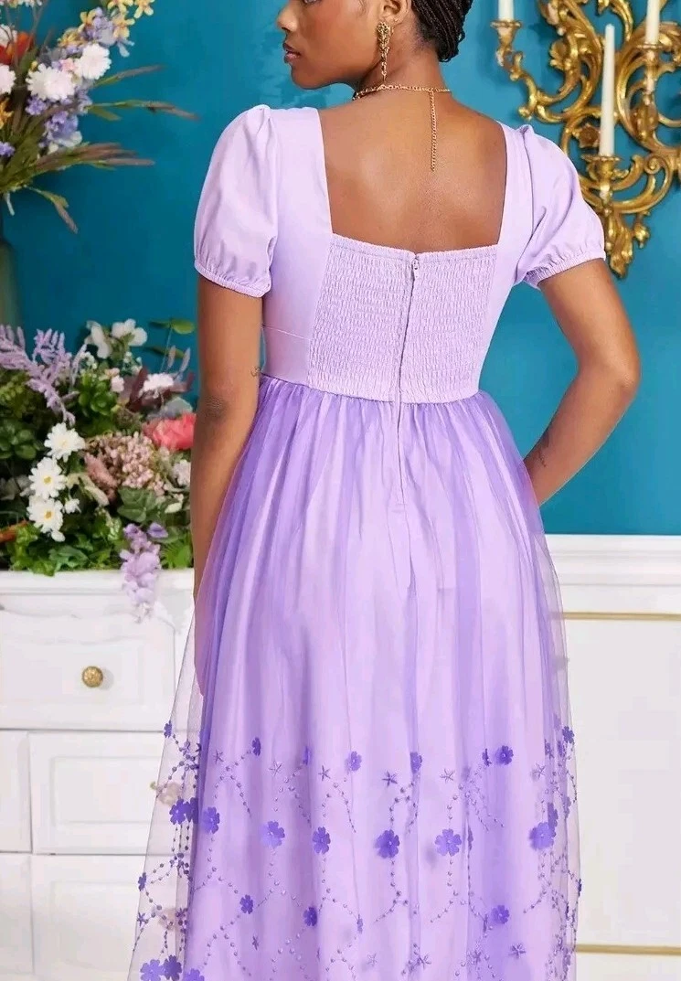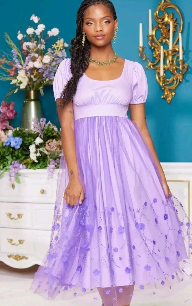 A super beautiful   midi dress . Lovely lavender color with tulle floral embroidered skirt and puffy sleeves. Zip up back with stretch shirring .  Inspired by  Bridgertons  Kate Sharma.  This midi dress is light weight and perfect for spring and summer.  Can be dressed up or down or just worn as a costume. Size Large.  .  A Her universe exclusive .