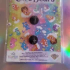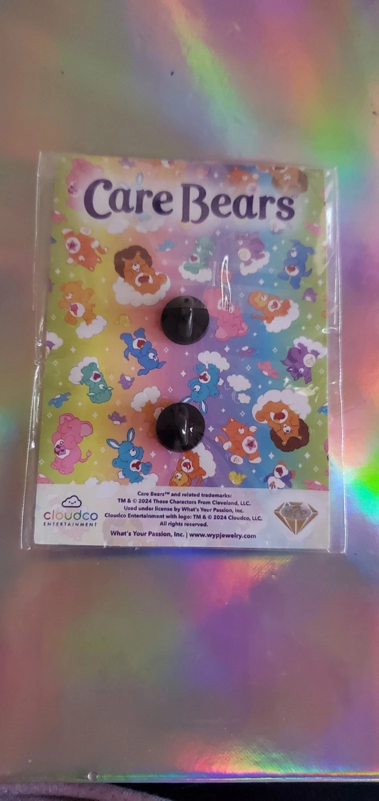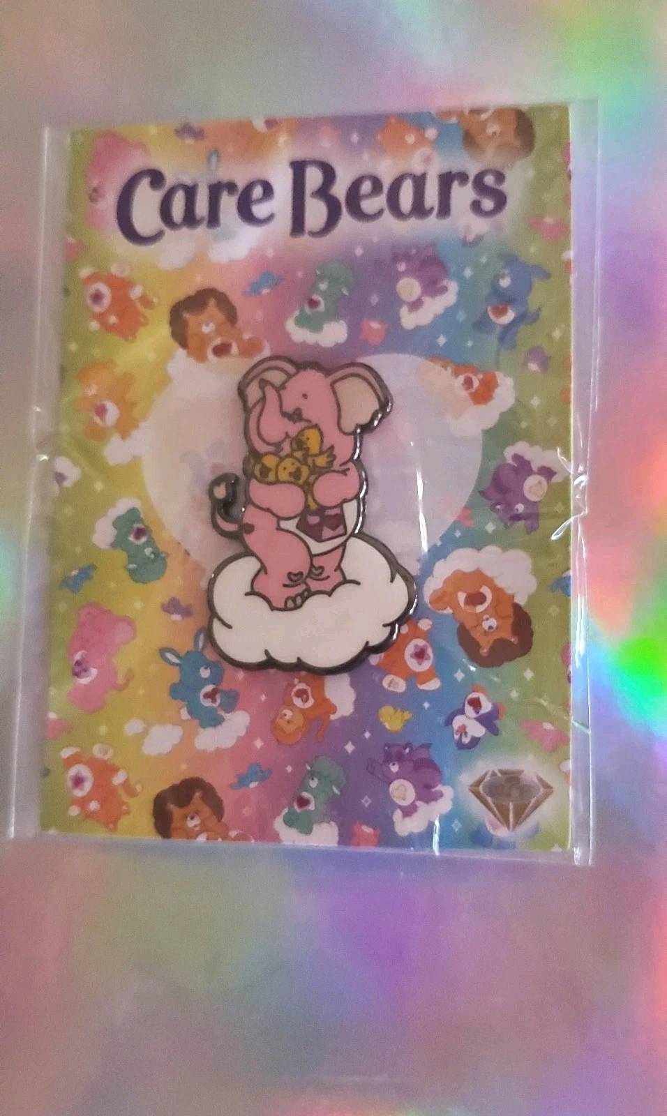 Adorn your clothes or bags with this dainty little care bears Care Bear cousin Lotsa Heart Elephant enamel pin. Lotsa heart is pink and hes standing a on a white cloud. silver backing with a care bear printed tag. Pin is about 2 inches.