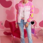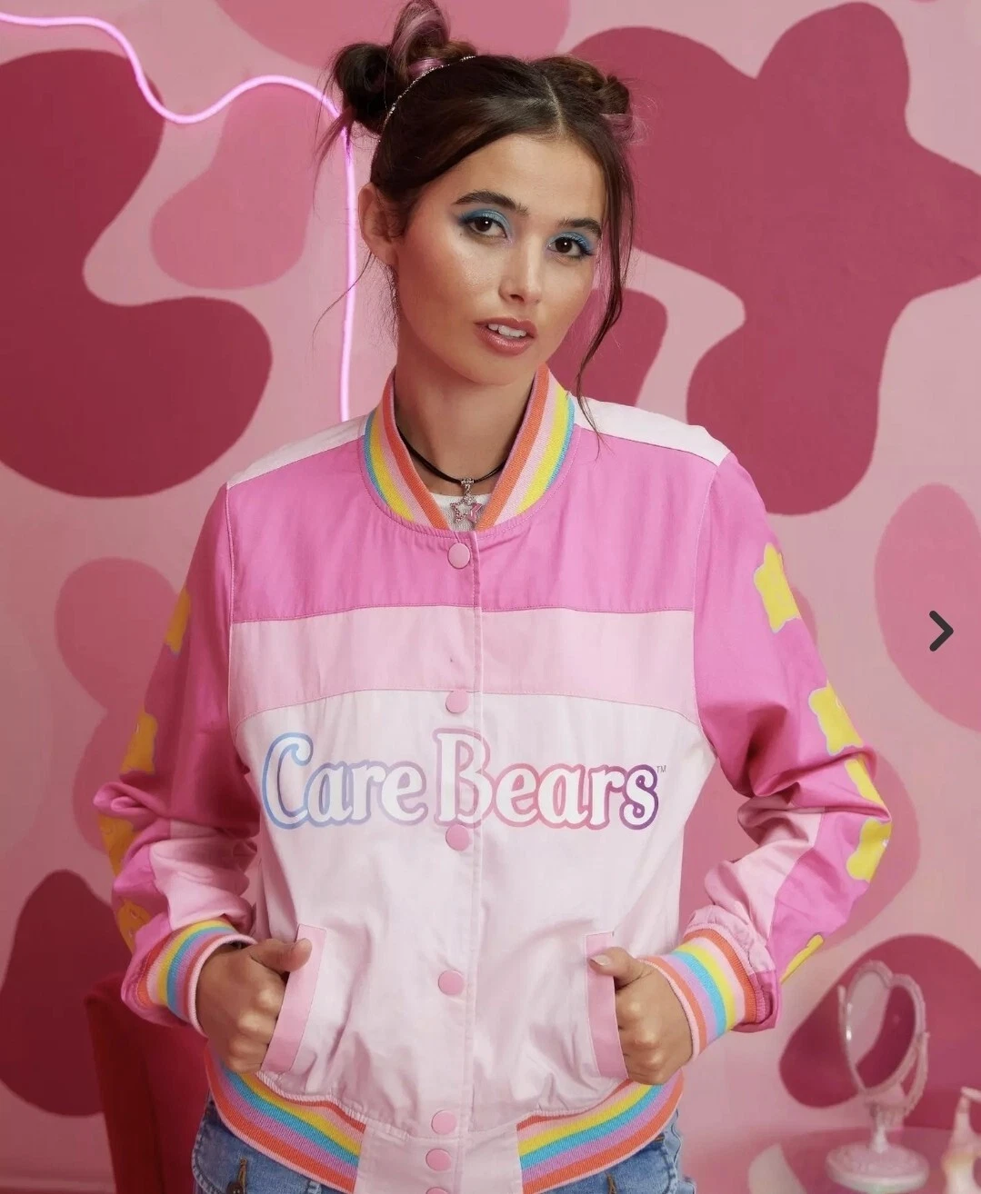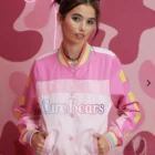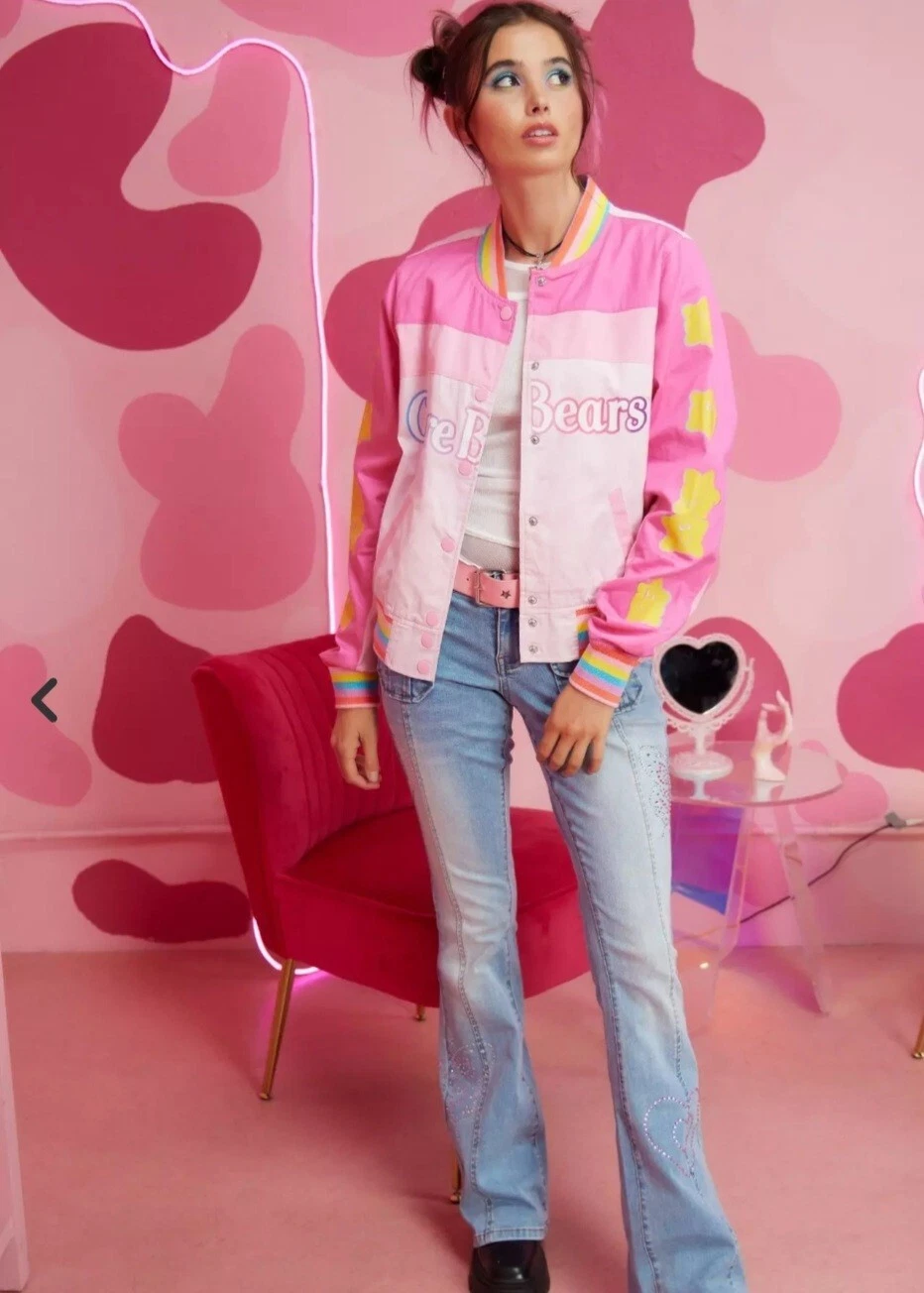 Light pink  care bears varsity jacket . Has  bubblegum pink sleeve, light pink body.  with rainbow care bear logo  on front. Rainbow trim collar, sleeve cuffs,  and bottom hem. Yellow stars are printed on the  sleeves.   Adorable  image of love a lot bear with sunglasses  riding in cloud mobile. Button up front   Jacket is in size L