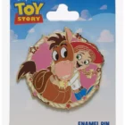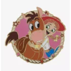 An excellent addition to any collection ! this round enamel pin had cowgirl Jesse and Bullseyes from Disney’s Toy story. Pin is colorful, round surrounded by gold toned trim with extremely cute Jesse hugging Bullseye on a pink background .