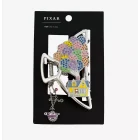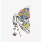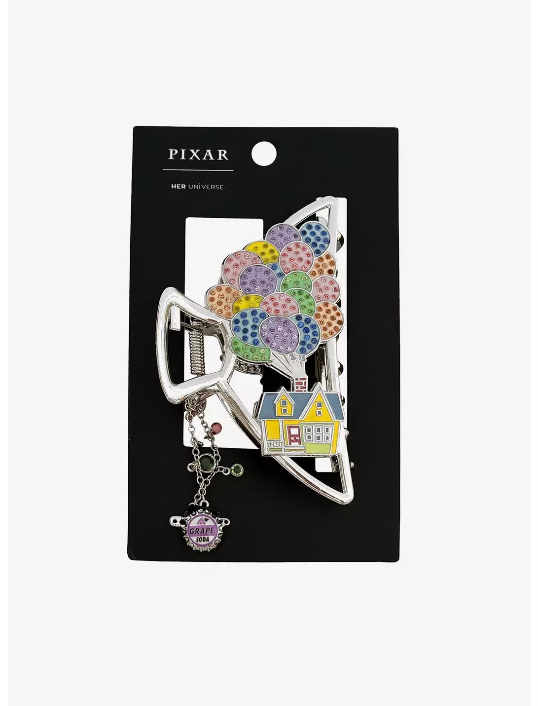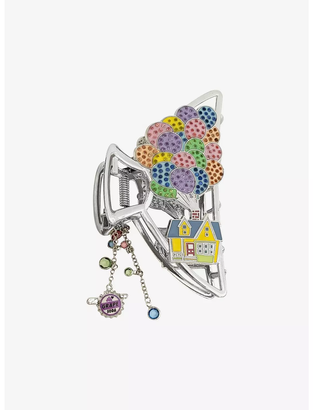Show your love of this Pixar Disney classic. This silver toned Up House hair claw clip has a multicolored sparkly rhinestone image of Carl and Ellie’s House with balloons on top. Decorated with sweet little rhinestones and grape soda button charm hanfing from a silver chain.