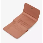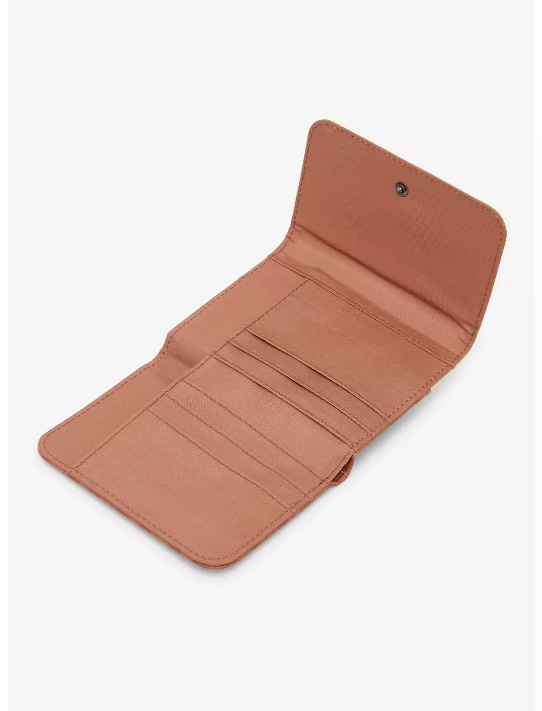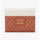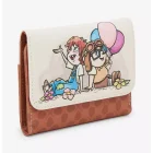 A super charming Disney Pixar UP wallet with a colorful image of a young Carl and Ellie on front. Has carl and Ellie sitting back to back with carl in his goggles and multicolored balloons in his hand. Light brown inside with six card slots, Bill pocket, silver hardware and snap closure, Brown and light brown back print.