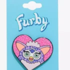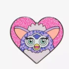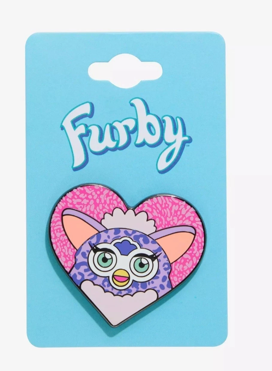 One for the 90’s kids. A furby heart shaped  enamel pin.   This pin has a bright pink printed  background  with a cute purple  green eyed furby  image in the middle.  Push pin backing