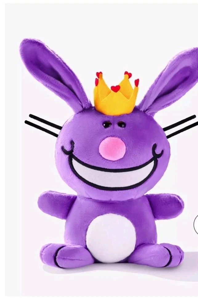 Bring it on back to the early 2000’s with a super cool Happy Bunny Purple plush. Happy Bunny is smiling while wearing a metallic gold plush crown, Approx 8 inch plush is very soft . Relive some nostalgia with this cheeky plush , It even has a lip mark on its backside .