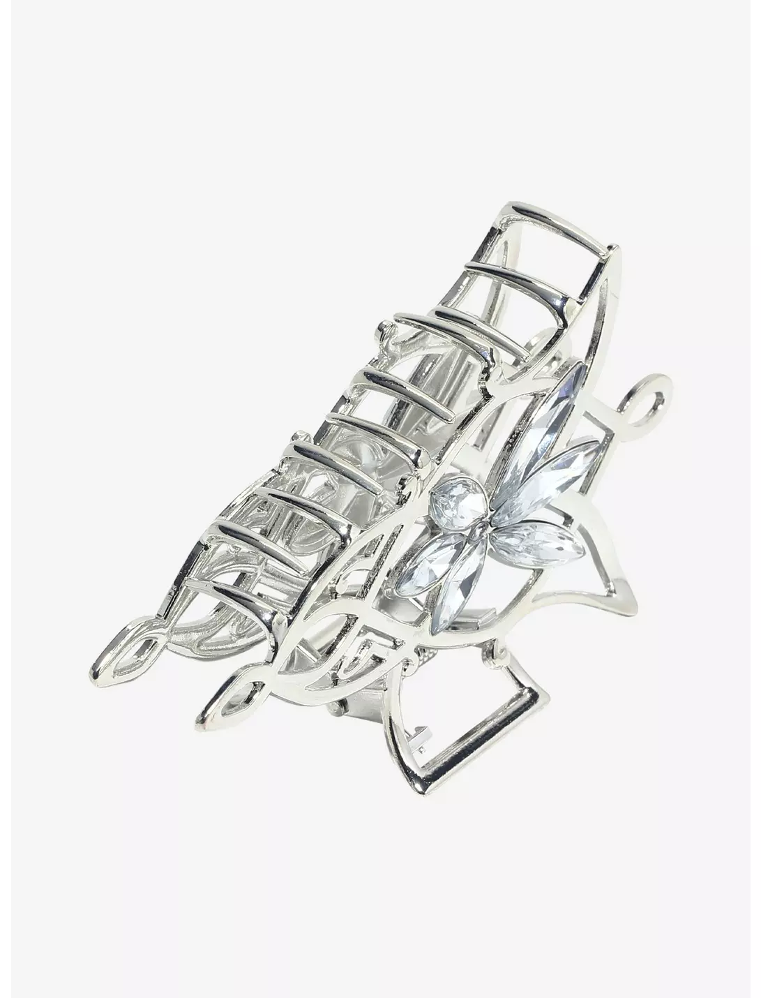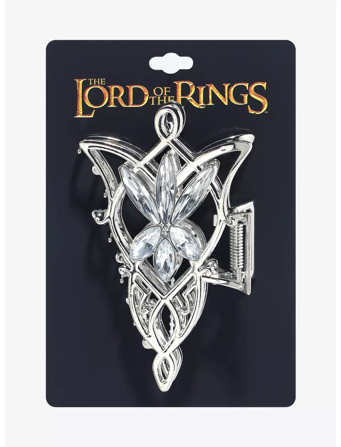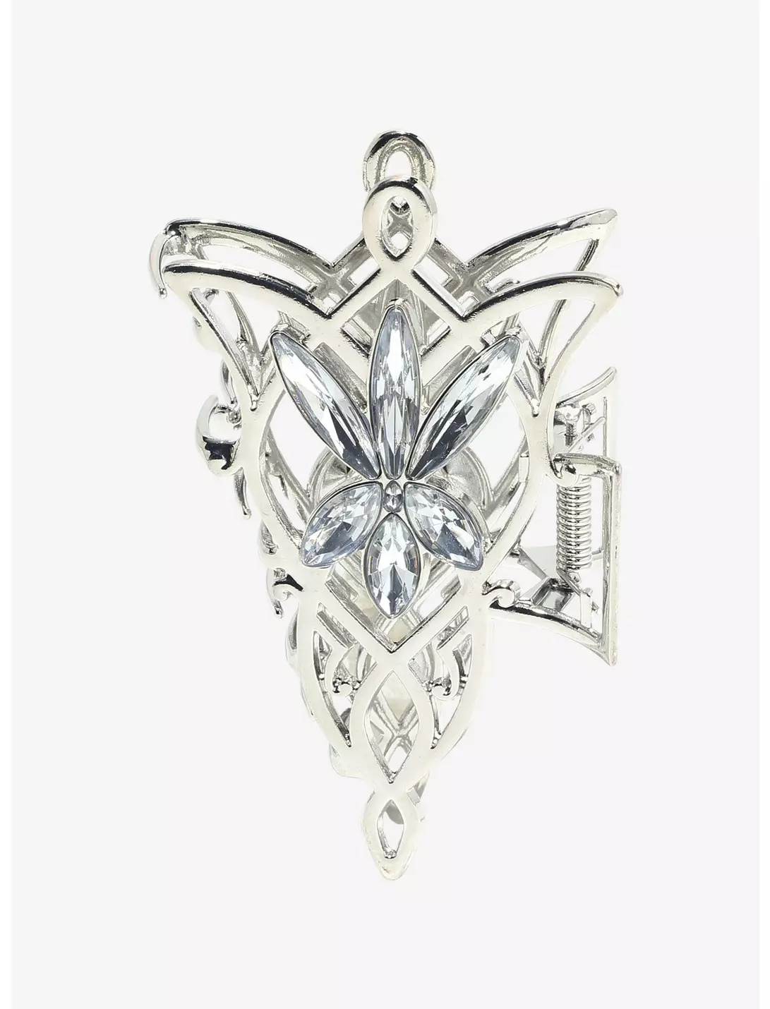 Decorate your hairdo with this immensely beautiful Arwen Evenstar hair claw clip. Siver toned with crystal detail made to look like Princess Arwen’s Evenstar necklace. Silver with clear rhinestone detail.