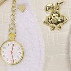 Qhite baf has  White felt rabbit ears  on front . with Gold hardware , white rabbit  gold front grommet. Blue bottom  and  pocket watch  charm on side. Double  top handle and removable  crossybody strap.
