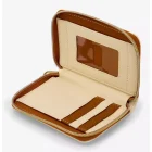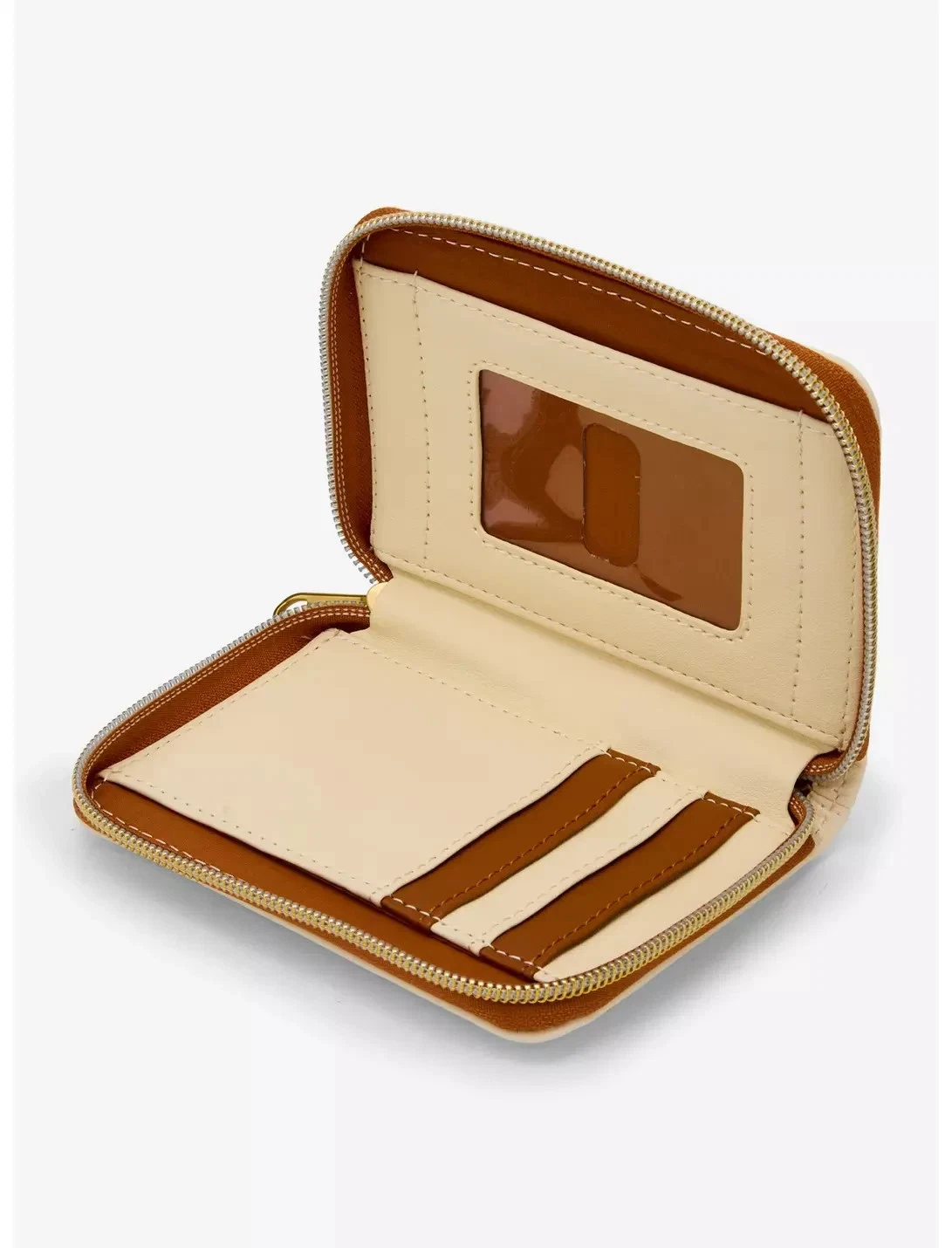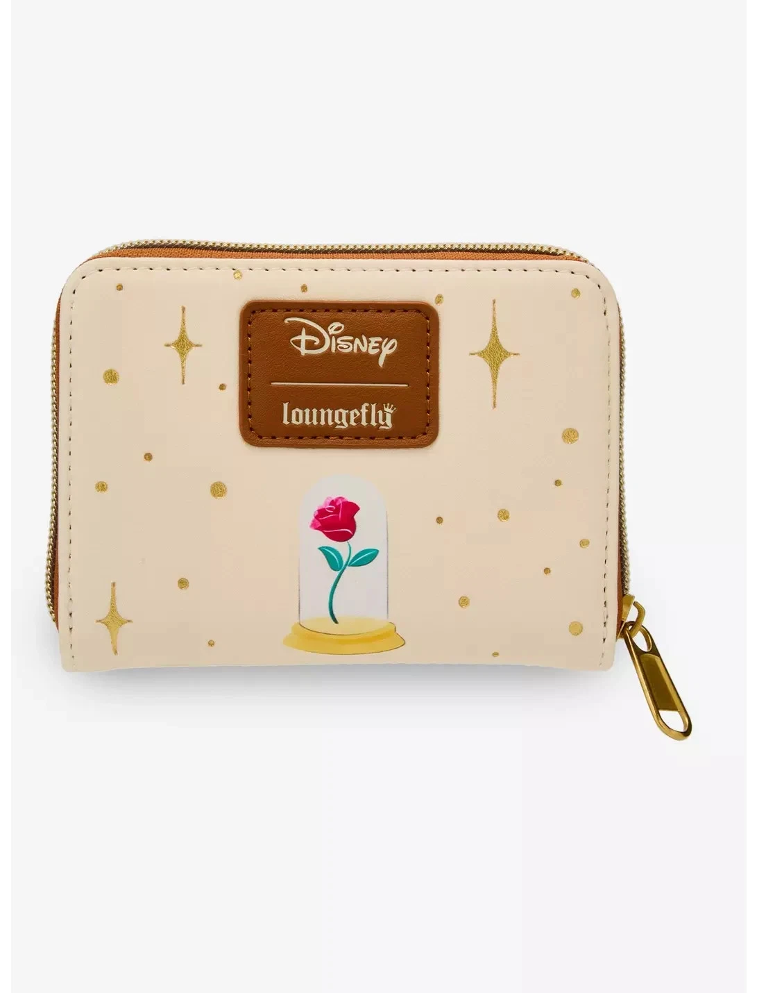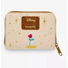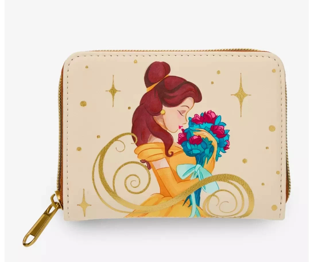 We know Beauty is found within but this wallet is beautiful inside and out. Cream colored Beauty and the Beast mini zip wallet Has a very pretty image of Belle in yellow with a flower bouquet. Golden yellow star /sparkles and scroll image around her. Gold colored hardware. Iside has both cream and brown card slots and I.D. Window. Back has an even prettier image of the enchanted rose with Loungefly brand patch. Faux leather