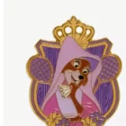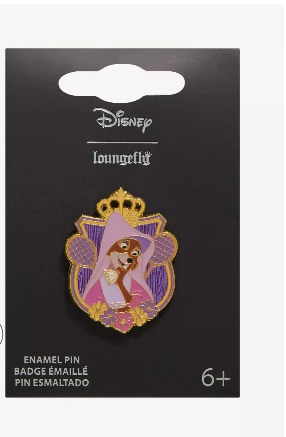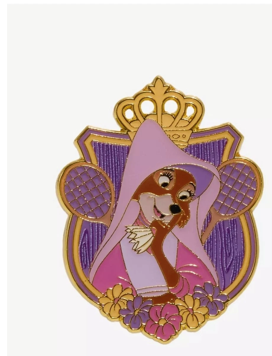 We’re somewhat obsessed with this rarely seen disney Robin Hood Maid Marianne enamel pin. Gold toned back has Maid Marianne pic on front in her lilac outfit with her tennis racket, Comes with tag attached,