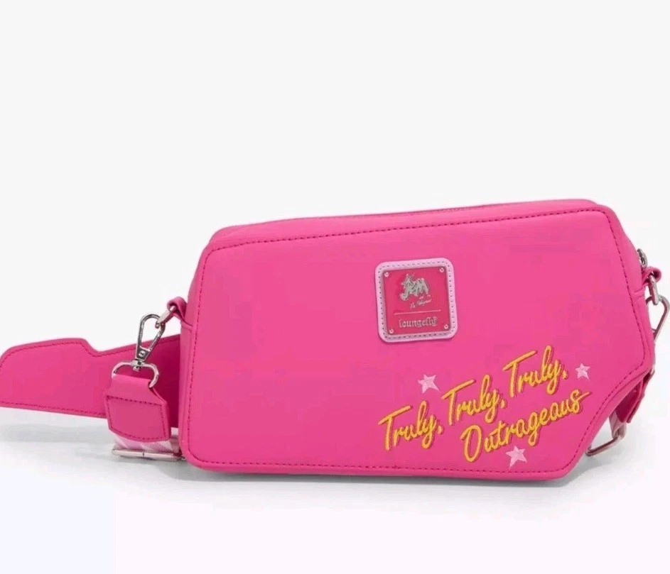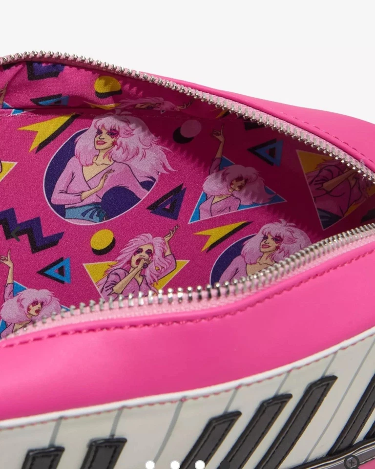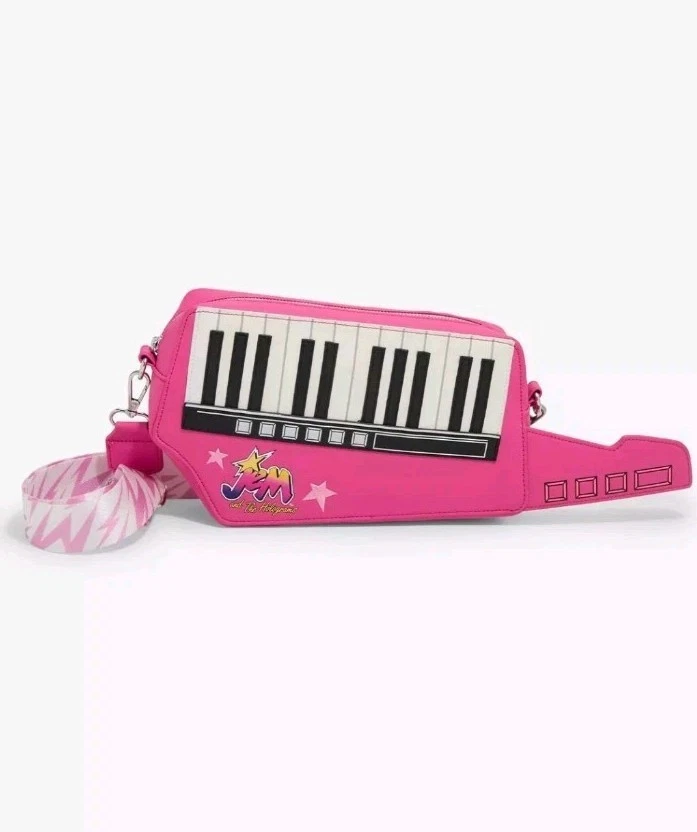 Loungefly Hasbro  Jem and the Holograms keyboard shaped crossbody bag. Pink bag  shaped like a keyboard  guitar. Has piano keys  on front with  metal loungefly  plate on back as well and jem and the holograms truly outrageous logo.  All over print inside lining. Adjustable crossbody strap.