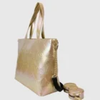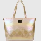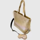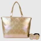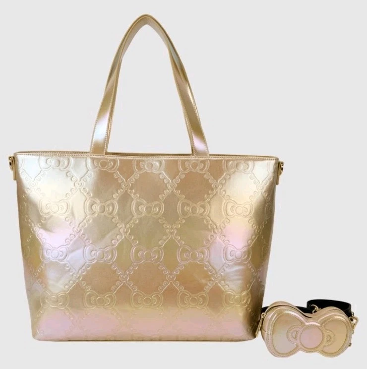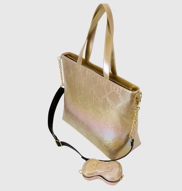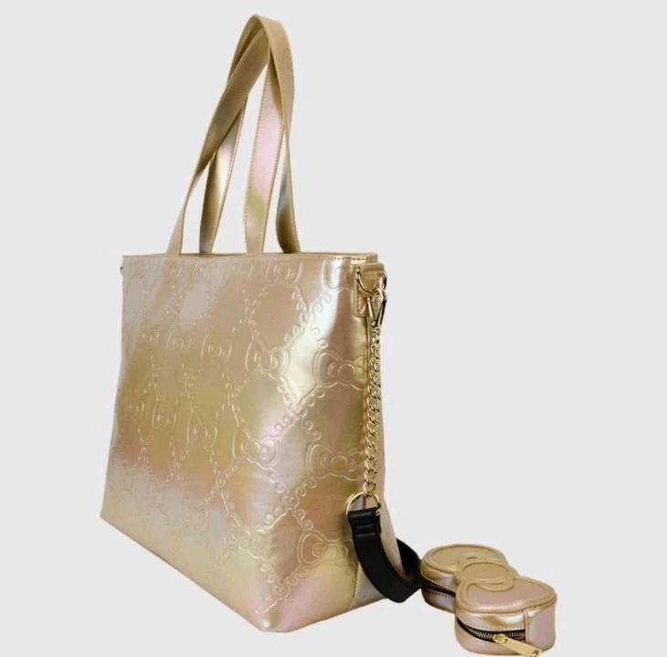 A lovely Gold Sanrio Hello Kitty tote. Large tote has double top handle and zipper. Comes with a gold Hello kitty all over embossed silhouette image. As an extra perk . it has a gold bow shaped coin purse. Black lining with gold hello kitty 50th Anniversary logo. 18 X 16 in size