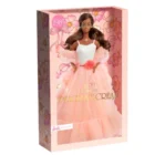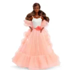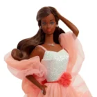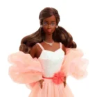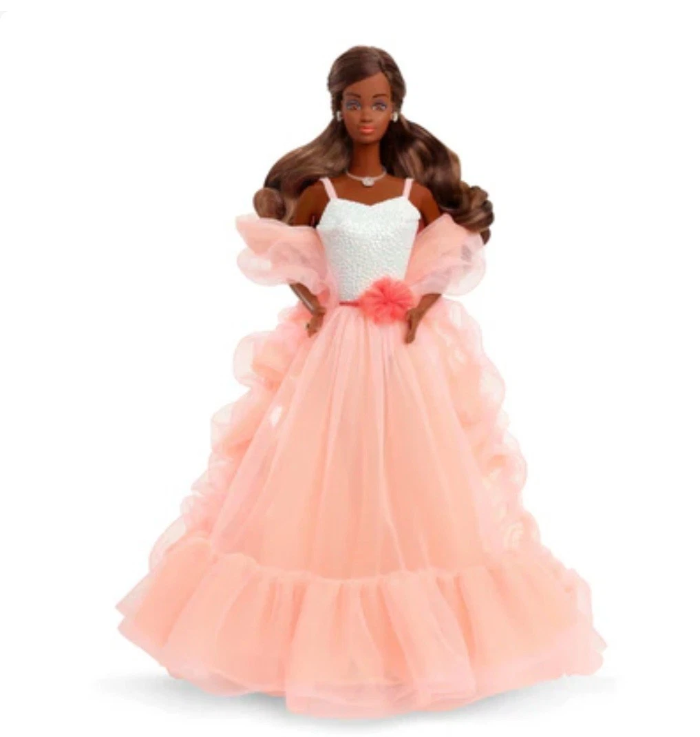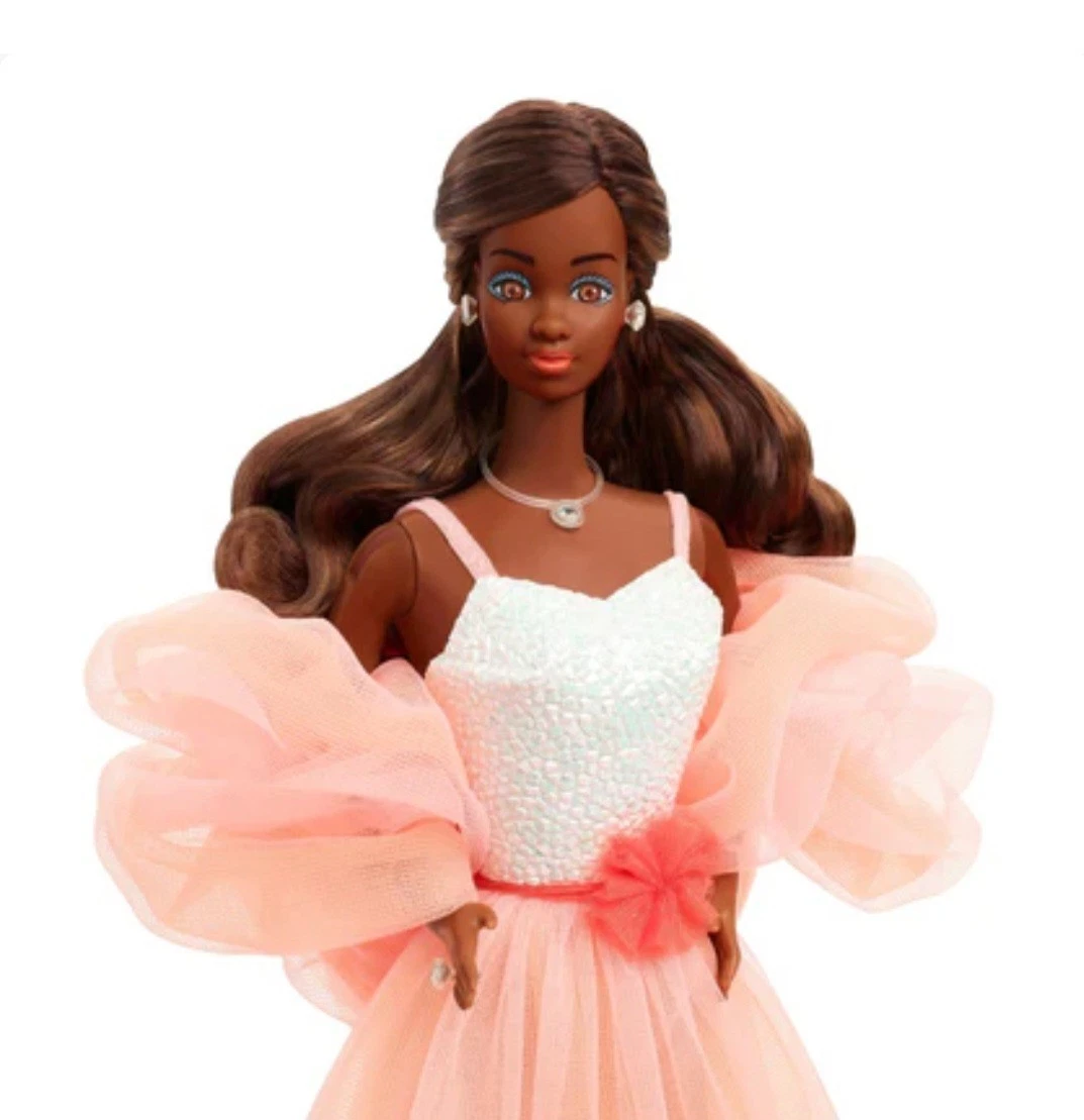 This is an exciting new arrival. A beautiful reproduction of the barbie peaches and cream doll from the 1980’s. Exclusive from Mattel . it’s the Brunette Barbie. This special doll is 12 inches tall. Has brown hair, brown eyes with played up eye make-up look, rhinestone necklace and and ring, She’s wearing an extremely pretty peach colored tulle gown with shiny cream bodice and coral floral belt on her waist. She has a pair of peach pink colored shoes. Comes packaged in a floral themed box . A real must for any 80’s kid to have.