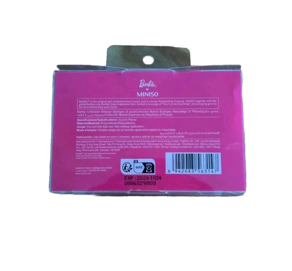 Miniso Brings you a ultra cool and very pink Barbie themed beauty blender sponge set. Set of 3 sponhes to blend your make up to perfection. comes with one hot pink sponge , one light pink amd one white blender. sponges have barbie logo on each. They come as one in a plastic barbie logo printed box.