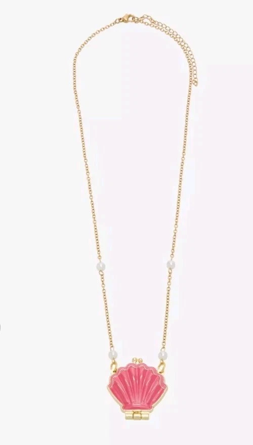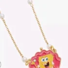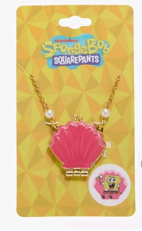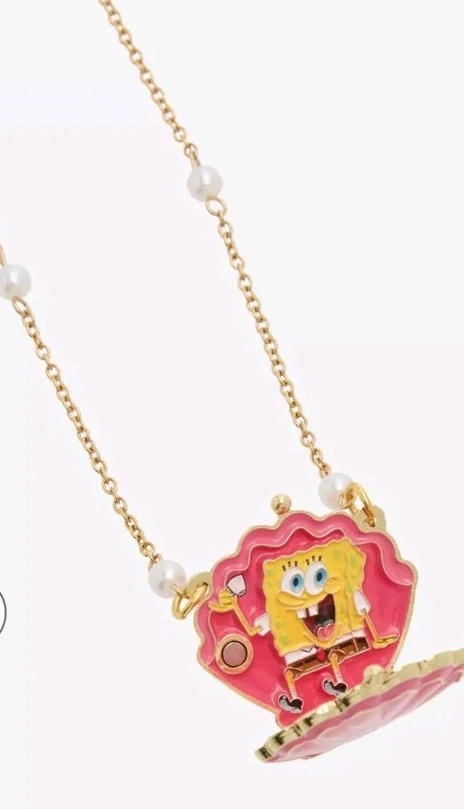 Spongebob Squarepants Pink clam shell locket necklace. Gold toned chain with pink clam shell pendant that opens up to a picture of Spongebob. Aprrox 16 inch adjustable chain decorated with faux pearsl around chain. kiss lock clam closure . A must for all fans of the classic series.