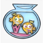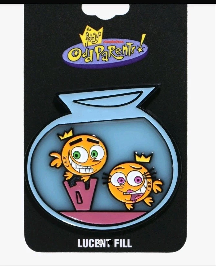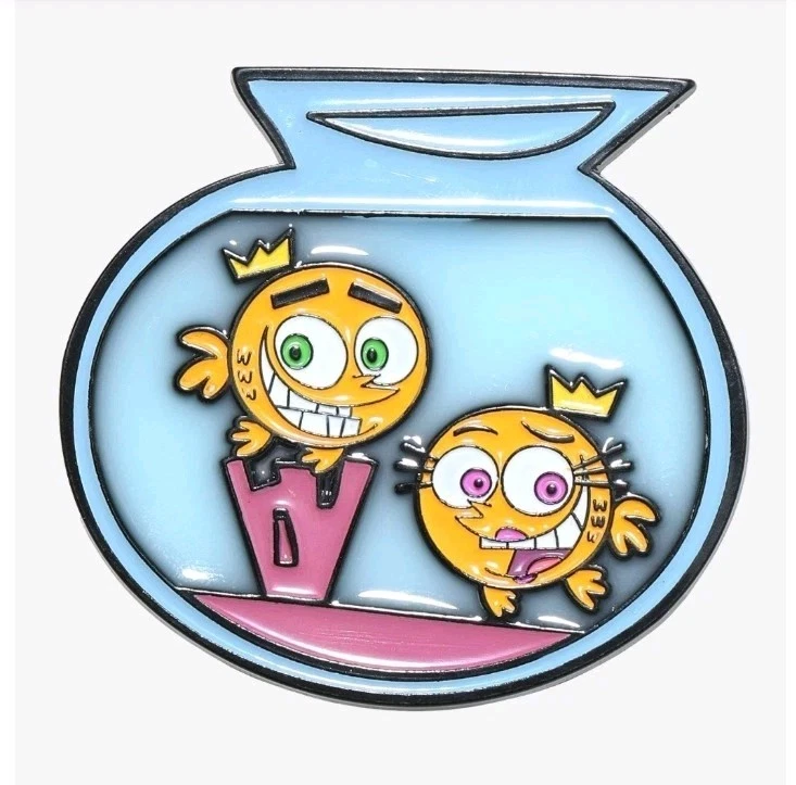A highly original looking fairly odd parents lucid enamel pin. shaped like the fairly odd parents fishbowl has Cosmo and Wanda in fish form . Has lucid overlay that looks like glass. Approx 2 inches. . wear it proudly on jackets ,shirts, or bags. Meta silver backing with push pin.