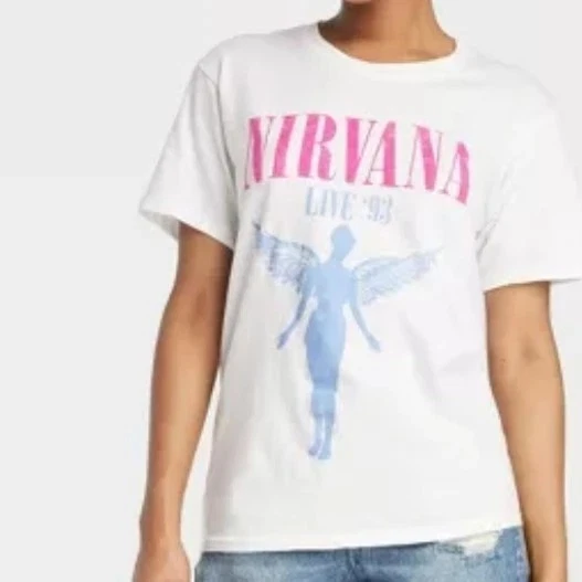 White Nirvana Band Graphic tee. Has the In utero angel print in Blue wirh Live and Loud 93′ text with Pink Nirvana Logo from MTV. Short sleeve crewneck . Size Large.