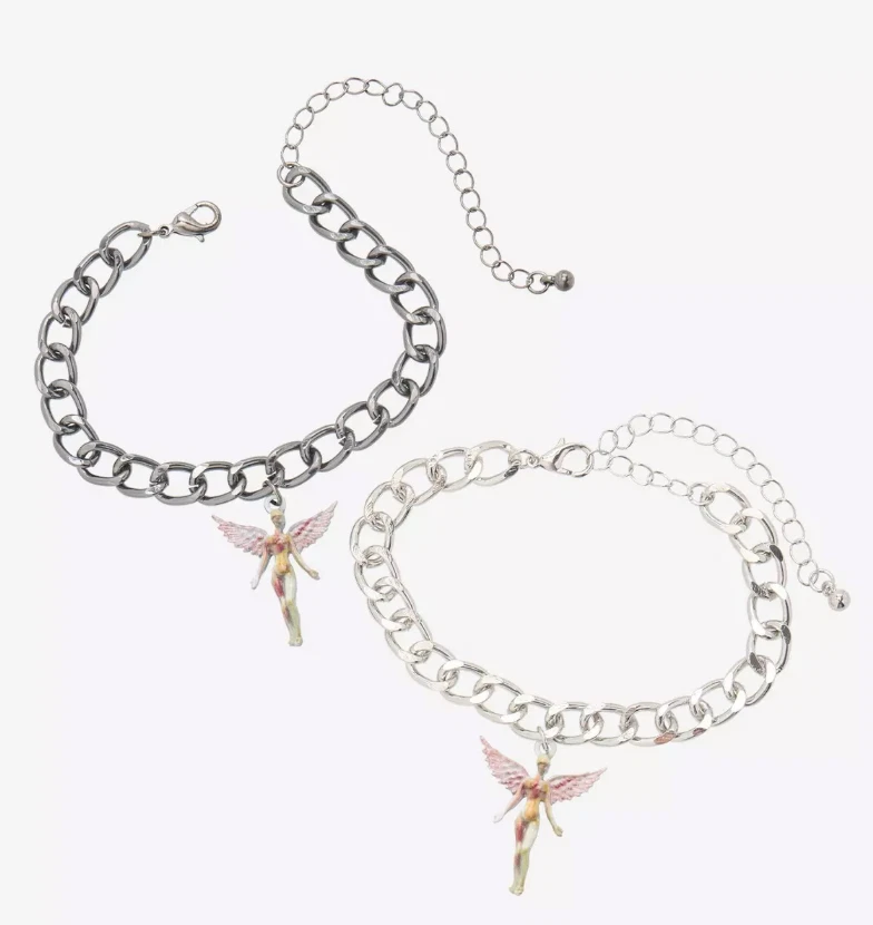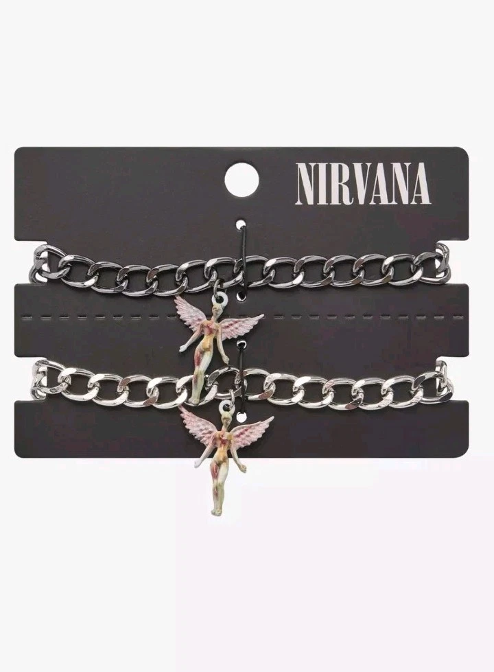 A ust for any Nirvana fan.  Inspired by their  third classic album  in utero . Set of 2 chain link bracelets. Silver toned  adjustable chain links. Each bracelet has a a Angel charm  like on the cover. Each bracelet is about 5 inches and has extenders for adjusting sizes.  Has black tags attached with band logo on top.