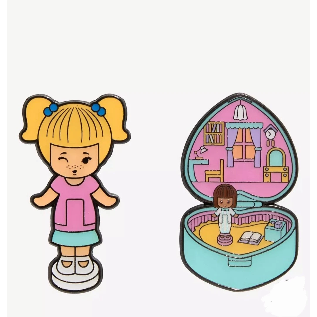 We;re all about Polly Pocket here. This lovely little enamel pin set is perfect for fans of the legendary toy. Set of two pins. One is a little bLonde doll shaped pin and the other a little green heart shaped compact. Silver push back pin and backing. Each pin about 2 inches. Wear your polly pocket love with pride by sporting this pin set on jackets, sweaters, blouses or just bags.