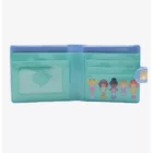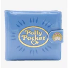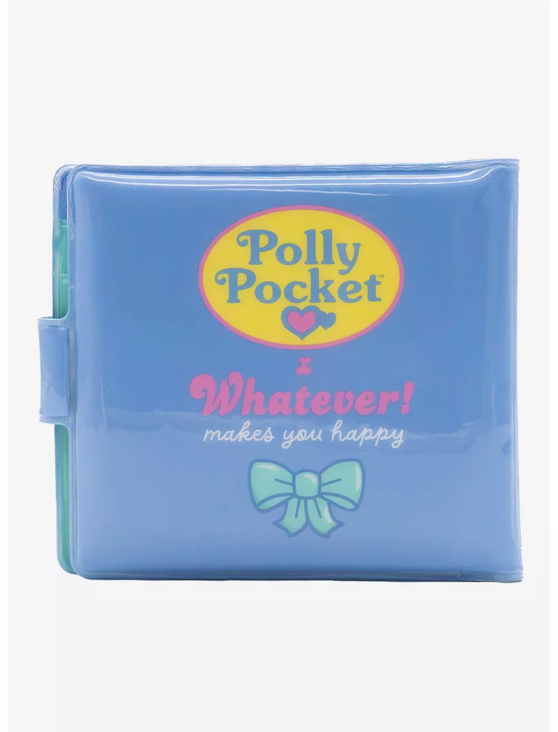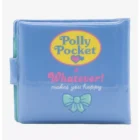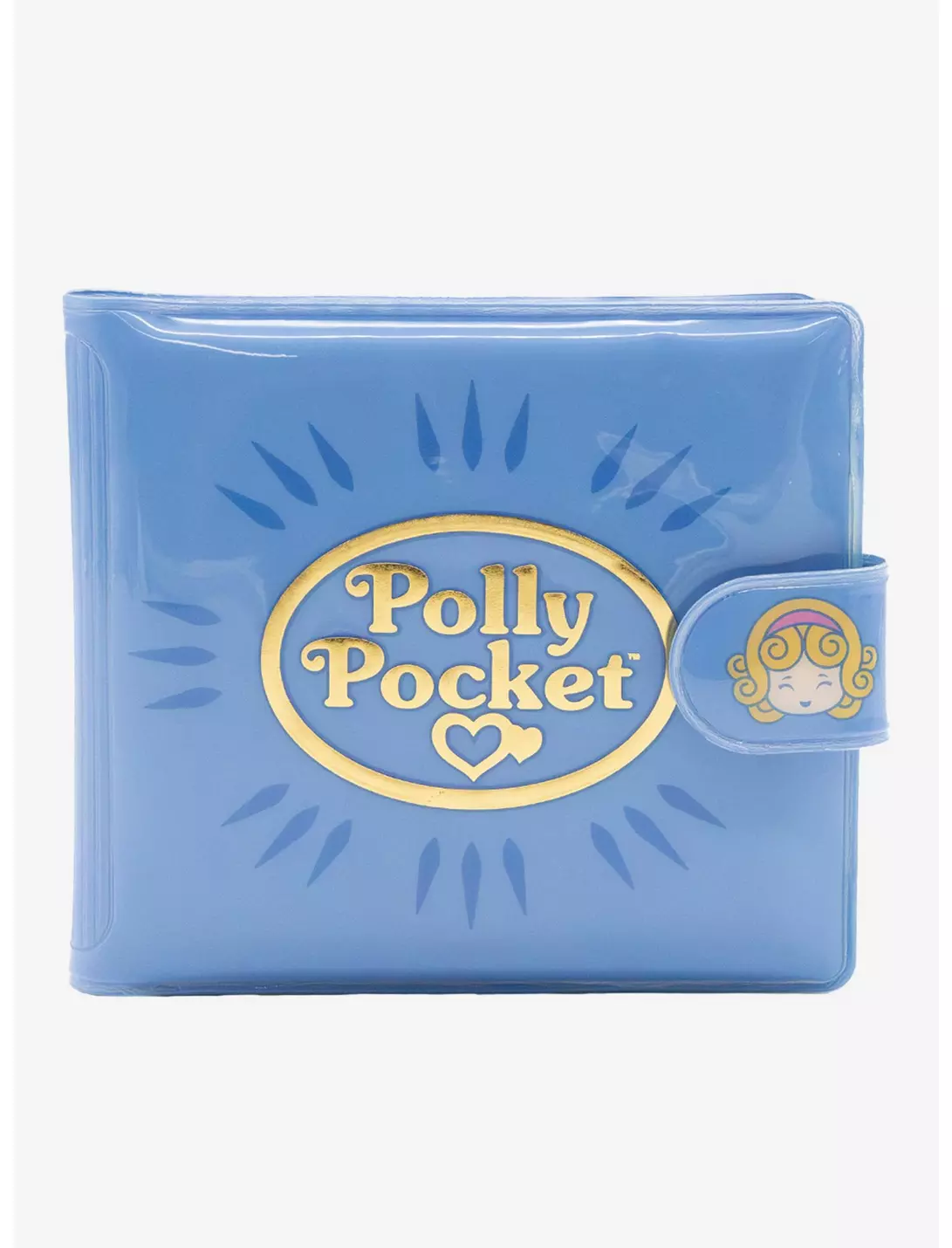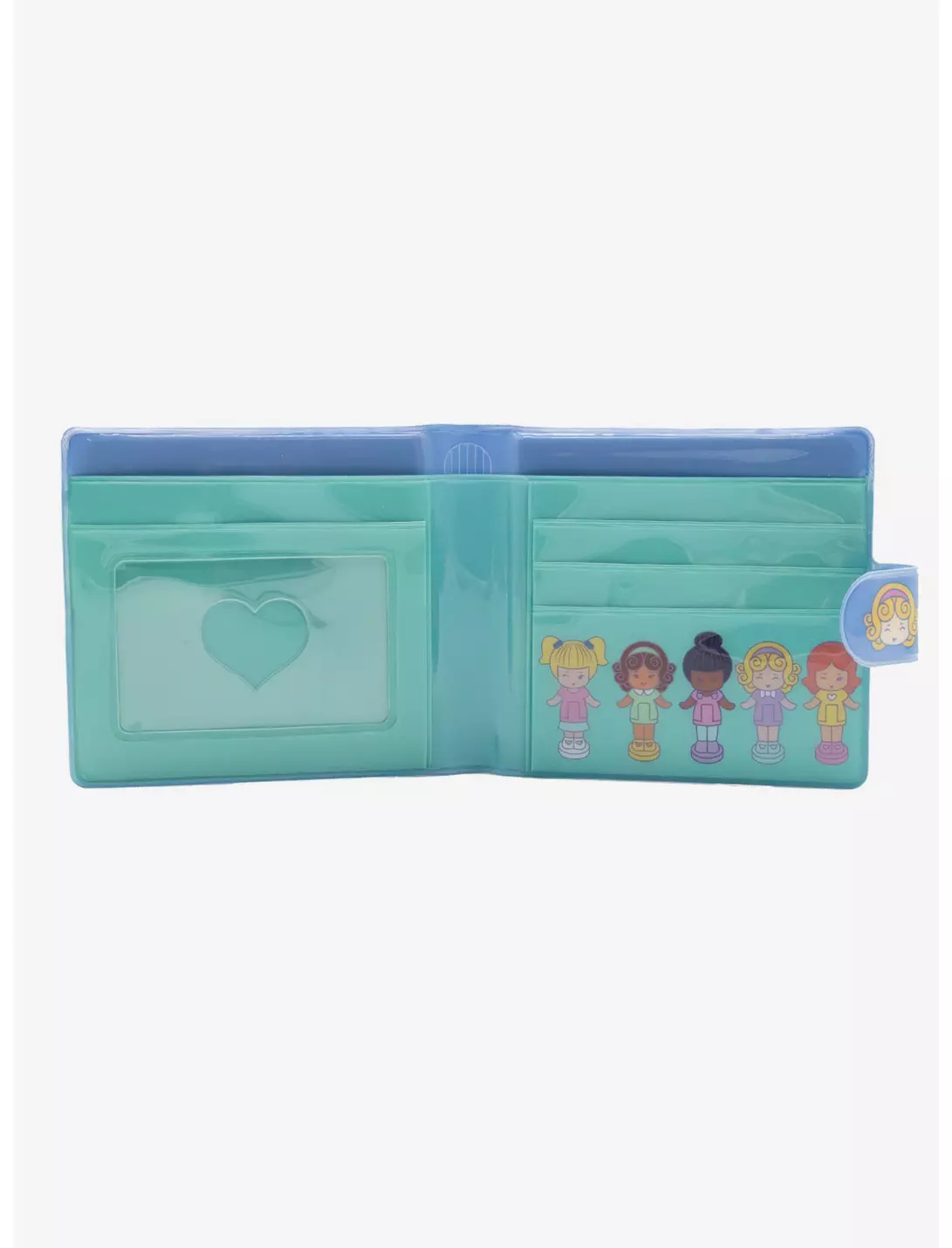Wharver makes you happy brings you this Polly Pocket light blue and gold vinyl snap wallet. Front has gold Polly pocket logo, Inside has 3 doll print. Inside has 3 card slots, clear heart shaped ID window. Back has Polly pocket and whatever makes you happy logos.