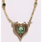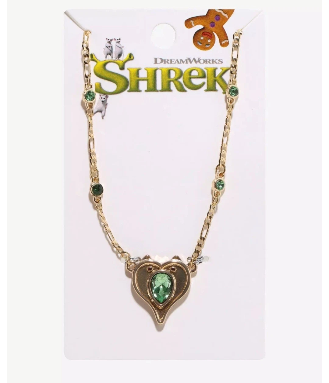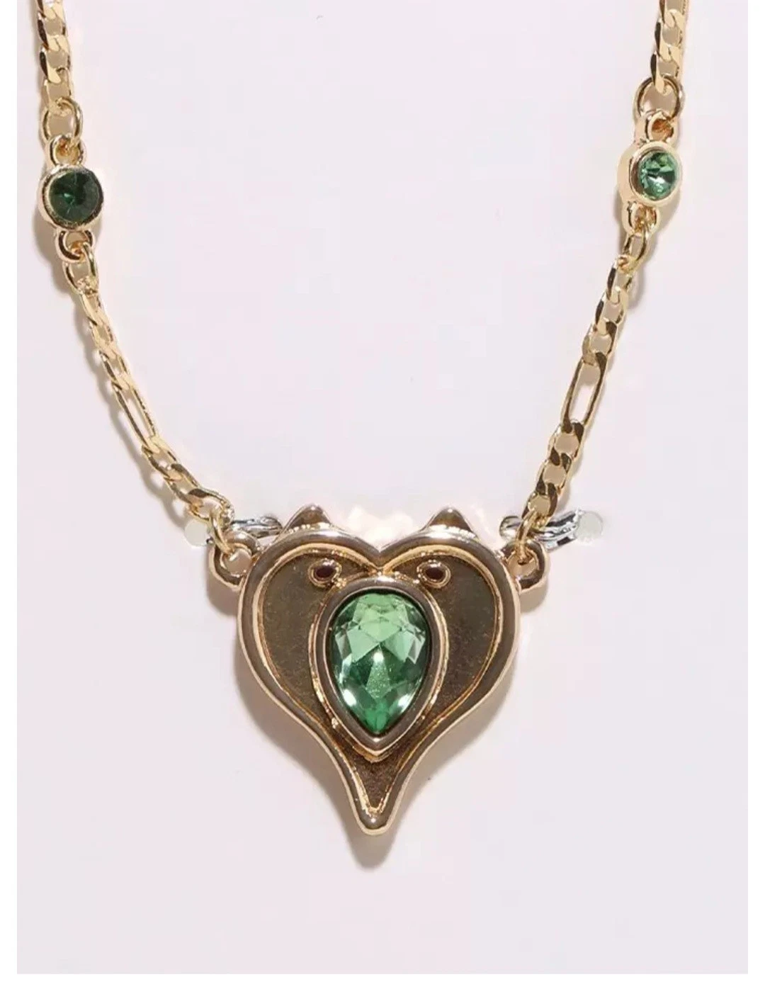 Gold toned Shrek Fiona heart replica necklace. Gold toned with green rhinestone in center with freen stones around chain.