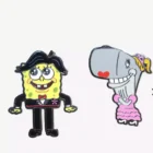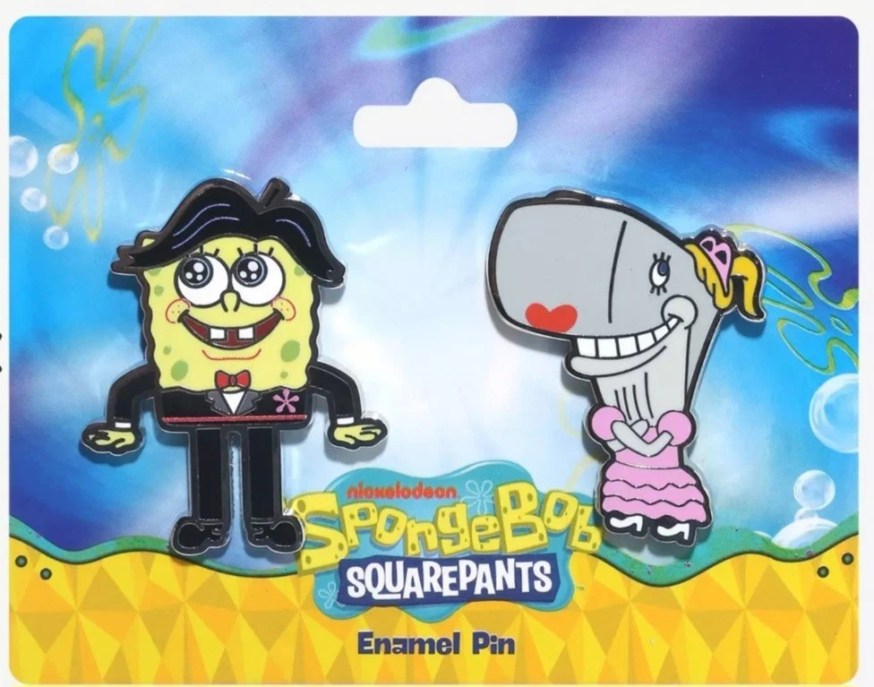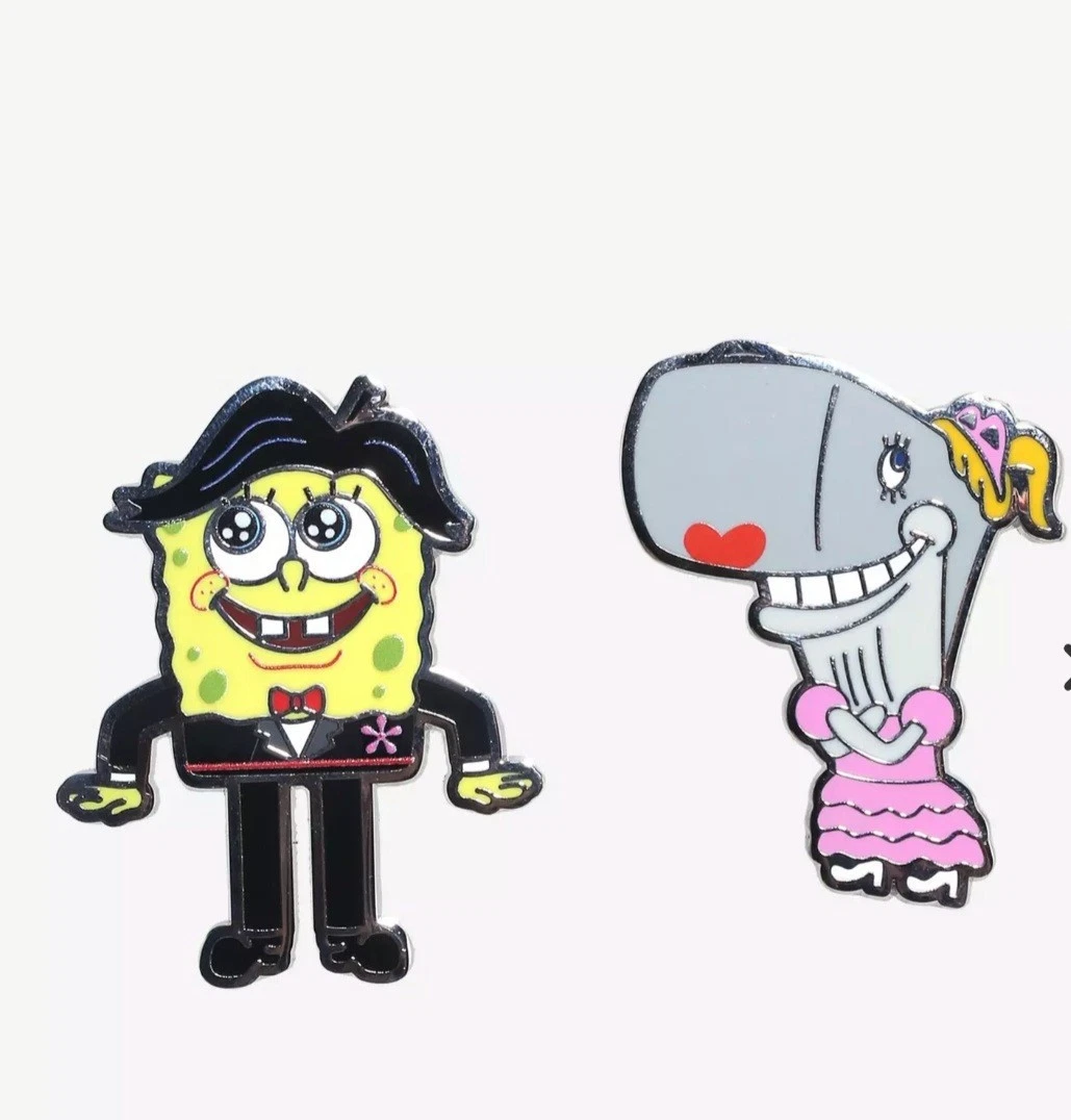 Check out this incredibly cool spongebob squarepants Enamel pin set of Spongebob And Pearl Krabs . From the prom chaperone episode, Spongebob is adorned in a tux with black wig and pearl is in her pink dress. Push back pins. Individual pins but sold as a set. These pins will surely make every Spongebob devotee smile