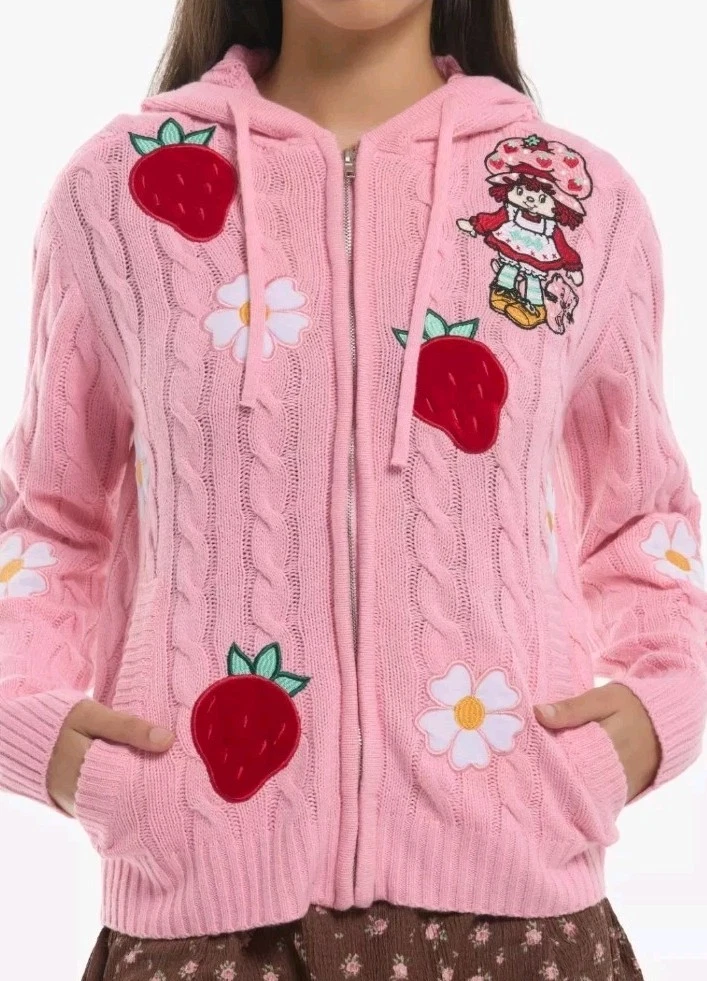 Show your sweet side in this soft pink strawberry shortcake cable knit zip up hoodie. Hs  cute patches  of  strawberries, and daisies.  With a cute embroidered image of strawberry shortcake on chest with her pink kitten custard Hooded . Silver zipper . Size M.