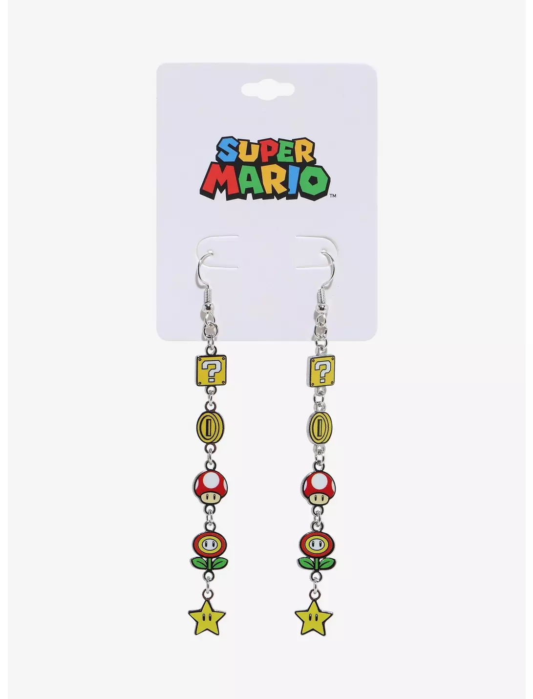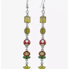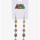 Gamers unite with this  super Mario Bros icon hook icon  drop earrings.  Has  different icons from the game icluding   mystery box,  coins, mushrooms , flowers or stars.   silver  toned hooks