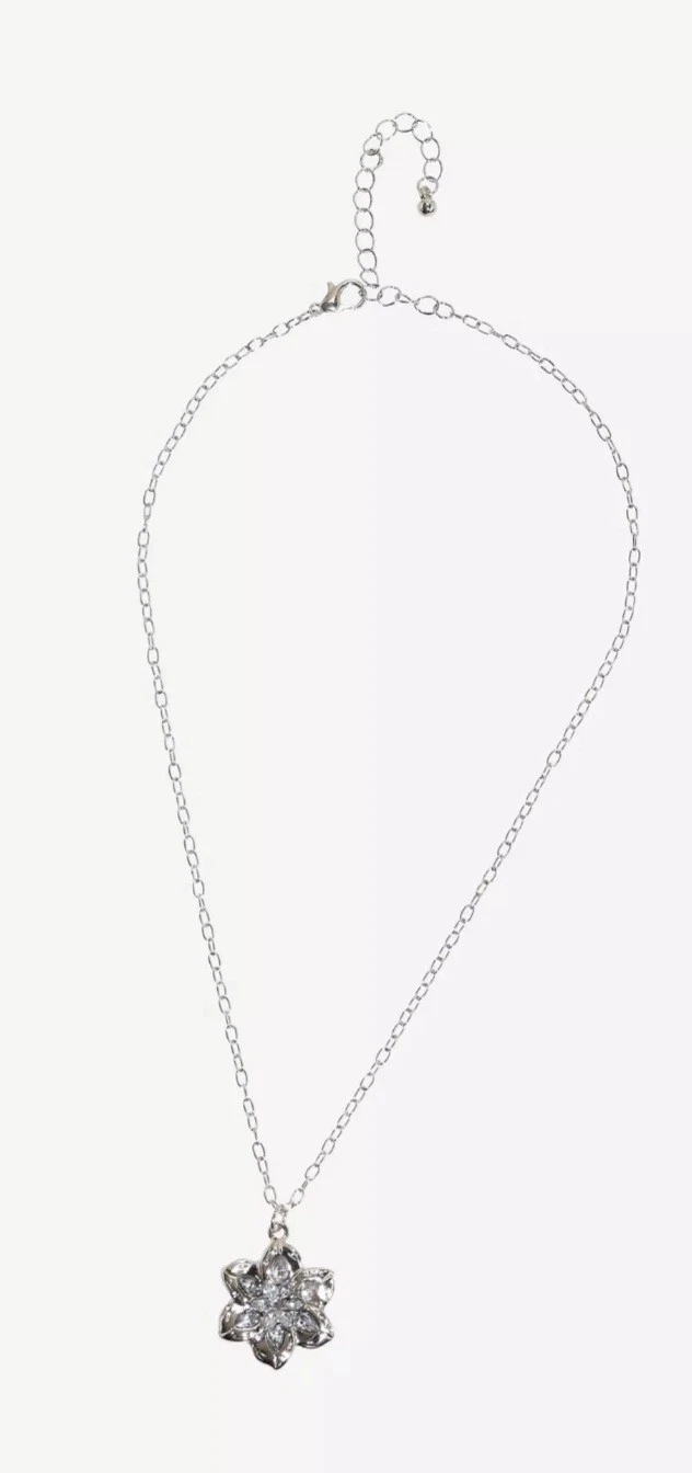 A beautifully inspired  Lord of the Rings Galadriel  floral nenya necklace . Silver plated with rhinestone flower pendant. A 16 inch chain with 3 inch extender. themed after the lady of light.